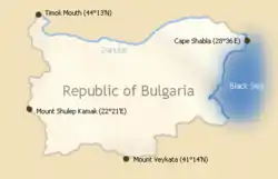 - ↑ Новаков, Красимир (2000–2008). «Най-крайните географски точки на България» (em búlgaro). Водач за българските планини. Consultado em 2 de dezembro de 2014. Arquivado do original em 9 de julho de 2010