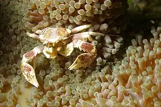 Os caranguejos-porcelana da família Porcellanidade têm aparência semelhante em muitos aspectos os caranguejos verdadeiros, nomeadamente um corpo achatado e arredondado e um arranjo de apêndices similar. Apesar dessas semelhanças externas, os caranguejos-porcelana não têm uma relação filogenética estreita com os caranguejos verdadeiros, sendo antes parentes próximos da família Galatheidae (os sastres ou galateias).
