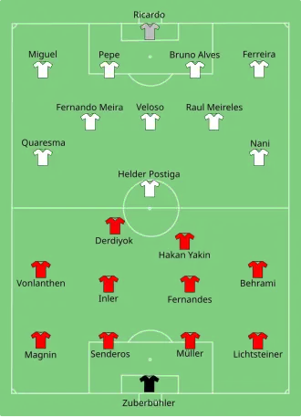 Portugal perdeu com a Suíça por 2 golos a 0, ambos marcados por Hakan Yakın, que foi considerado o melhor jogador da partida.[13]