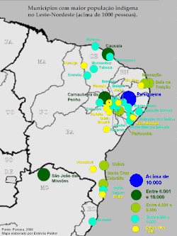 Os estados com a maior proporção de povos indígenas na população são Pernambuco (0,6%) e Maranhão (0,5%), nono e décimo colocados no quadro geral dos estados. O município com a maior população indígena é Pesqueira (PE), com população indígena de 9.335 pessoas.[1]
