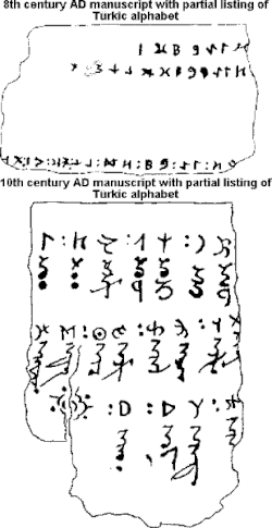 Os escritos runiformes turcos (ver Alfabeto de Orkhon), distintos dos outros escritos tipológicos próximos no mundo, não têm uma paleografia uniforme como, por exemplo, têm as runas góticas, conhecidas pela excepcional uniformidade de sua língua e paleografia.[65] Os alfabetos turcos são divididos em quatro grupos, o mais conhecido deles é a versão orkhon do grupo enisei.