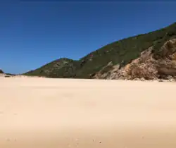 O acesso por automóvel implica deixar o carro a cerca de 900m da praia, sendo o posterior acesso pedonal feito através de um trilho estreito que percorre um vale com encostas verdejantes, áreas de pinhal e afloramentos rochosos calcários onde se avistam grutas. A praia é muito tranquila e tem um ar isolado do mundo. Existe no lado nascente uma ruína de uma fortificação do século XV.[2]