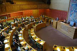 A sala onde o Conselho Municipal se reúne a Bystyresalen é semicircular. É revestido de carvalho e tapeçarias, a mais notável das quais foi projetada por Else Poulsson, sobrinha do arquiteto. Tecido por Else Halling, ele retrata Santa Hallvard e as sete virtudes. O artista esperava que o design lembrasse os políticos da cidade sobre ética e boa tomada de decisões.