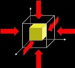Habitualmente esta pressão é denotada como , ou nas três direcções dos eixos do elipsóide das tensões.[1][2] A cada profundidade, é possível individualizar no subsolo um qualquer ponto sujeito à pressão resultante do peso das rochas de recobrimento, decompor a tensão resultante ao longo de um conjunto de três eixos perpendiculares entre si e construir o correspondente elipsóide de tensões. Nesse elipsóide é possível fazer os eixos coincidir, respectivamente, com a direcção da máxima tensão, de mínima tensão e de tensão intermédia. Em áreas tectonicamente estáveis ou em regime de tectónica distensiva, o eixo principal deste elipsóide é orientado verticalmente e corresponde, em sentido e valor, à pressão litostática.[3]