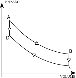 No segmentos e são processos isotérmicos (temperatura constante). Já os segmentos e são processos isovolumétricos (volume constante), sendo que a energia interna do sistema varia somente pela troca de calor com as vizinhanças do sistema