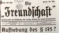 A mídia de massa destinada a um público homossexual era impossível na Alemanha Imperial por causa da censura, embora as publicações científicas fossem geralmente permitidas. A revolução alemã aboliu a censura. Os editores aproveitaram a oportunidade para vender uma infinidade de novas mídias que tratam de diferentes aspectos da sexualidade. A primeira publicação em massa para um público homossexual foi Die Freundschaft , aparecendo semanalmente com uma tiragem inicial de 20.000 cópias.[2]
