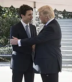 Após seu primeiro encontro presencial com o Secretário-Geral da OTAN, Jens Stoltenberg, em 12 de abril, Trump anunciou uma mudança em sua visão sobre a OTAN. Anteriormente, ele havia criticado a organização, chamando-a de "obsoleta" por não combater o terrorismo.[224] Em 18 de março, Trump pediu que os países membros da OTAN contribuíssem mais financeiramente para a organização.[225] Após a reunião na Casa Branca, Trump reconheceu que a OTAN estava engajada no combate a grupos como o ISIS, mantendo o "compromisso dos EUA com a OTAN, reiterando que os países membros devem aumentar o financiamento militar".[224][226][227]