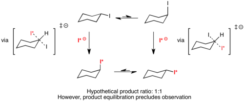Ernest L. Eliel propôs que a reação hipotética de iodeto de ciclo-hexil com iodeto radiomarcado resultaria em um estado de transição completamente simétrico.[12] Como os conformes substituídos equatorial e axial reagiriam através do mesmo estado de transição, ΔΔG ‡ seria igual a zero. Pelo princípio de Curtin-Hammett, a distribuição dos produtos deve então ser substituída na posição axial em 50% e substituída na posição equatorial em 50%. No entanto, o equilíbrio dos produtos impede a observação desse fenômeno.