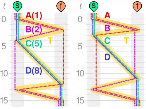 | 17 minutos | A e D cruzam o rio, levando 8 minutos | A B C D |