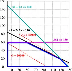 Aqui está um exemplo de problema de programação linear. Suponha que um fazendeiro tem um pedaço de terra de digamos, A km2, para ser semeado com trigo ou cevada ou uma combinação de ambas. O fazendeiro tem uma quantidade limitada de fertilizante F permitido e de inseticida P permitido que podem ser usados, cada um deles sendo necessários em quantidades diferentes por unidade de área para o trigo (F1, P1) e para a cevada (F2, P2). Seja S1 o preço de venda do trigo, e S2 o da cevada. Se chamarmos a área plantada com trigo e cevada de x1 e x2 respectivamente, então o número ideal de km2 de plantação com trigo vs. cevada pode ser expresso como um problema de programação linear: