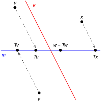 A transformação T é a projeção ao longo de k, sobrejetivamente em m. A imagem de t é m, e seu núcleo é k.