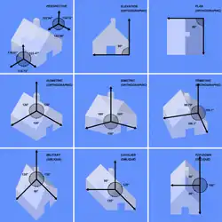 Se o normal do plano de visão (a direção da câmera) é paralela com um dos primeiros eixos (eixos x, y ou z), a transformação matemática é a seguinte; Para projetar o ponto 3D , , no ponto 2D , usando a projeção ortográfica paralela ao eixo y (onde o y positivo representa a direção para frente - vista de perfil), a seguinte equação pode ser utilizada: