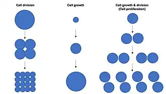 O tamanho das células depende tanto do crescimento quanto da divisão celular, sendo que um aumento desproporcional na taxa de crescimento celular leva à produção de células maiores e um aumento desproporcional na taxa de divisão celular leva à produção de muitas células menores. A proliferação celular normalmente envolve taxas equilibradas de crescimento e divisão celular que mantêm um tamanho de célula praticamente constante na população de células em proliferação exponencial. A proliferação celular ocorre combinando o crescimento celular com ciclos celulares regulares "G1-S-M-G2" para produzir muitos descendentes de células diploides.