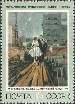 Durante os anos 1930, o desenvolvimento da URSS era o único tema dos filmes, da arte e da literatura.[97] Os heróis da exploração do Ártico eram glorificados.[97] O vigésimo aniversário da Revolução de Outubro foi homenageado com um trabalho de cinco volumes enaltecendo os feitos do socialismo e (no último volume) as "fantasias baseadas na ciência" do futuro, levantando questões tais como se o mundo inteiro ou somente a Europa se tornaria socialista em vinte anos.[98]