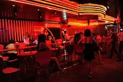 Mulheres ("bargirls"), ou homens, no caso de bares gays, ou transexual ("kathoeys") são empregadas pelos bares como dançarinas (no caso de bares go-go) ou simplesmente como recepcionistas que encorajam os clientes a comprar bebidas para elas. Além desses tipos de bares, há uma série de outros locais de comércio sexual. Na maioria desses estabelecimentos, as prostitutas são empregadas diretamente, mas em hotéis, alguns bares e discotecas, prostitutas autônomas podem solicitar clientes.[49][50] As prostitutas geralmente recebem uma comissão quando um cliente compra bebidas e serviços sexuais podem ser organizados para ocorrer no local ou em outro lugar (com o último exigindo que o cliente pague uma "multa de bar" para liberar a prostituta do bar).[23][51] Os relacionamentos estabelecidos em tais contextos imitam superficialmente a cultura de "namoro" do ocidente, com uma mistura de amizade, intimidade, entretenimento sexual e dinheiro.[52]