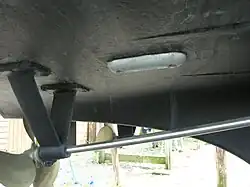 Ânodo de sacrifício em zinco (objeto arredondado) aparafusado na parte inferior do casco de um pequeno barco.