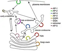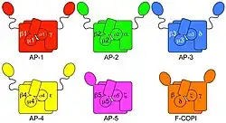 - ↑ Uma visão diferente dos 5 complexos de proteínas adaptadoras pode ser vista aqui: Mattera R, Guardia CM, Sidhu SS, Bonifacino JS. «Figure 1: Isolation of Tepsin as an AP-4 interactor». J Biol Chem. 290: 30736–49. PMC 4692204