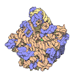 The two ribosomal subunits. Proteins are shown in blue and the RNA chains in brown and yellow.
