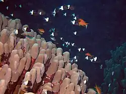 - ↑ a b c d «Pseudanthias squamipinnis, Sea goldie : fisheries, aquarium». www.fishbase.de. Consultado em 14 de outubro de 2022