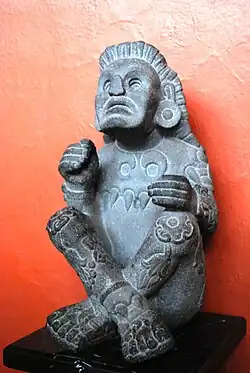 A estátua do "deus das flores" asteca, Xochipilli, um efígie de pedra do século XVI desenterrada no lado do vulcão Popocatépetl, representa uma única figura sentada de pernas cruzadas sobre uma base semelhante a um templo; seu corpo é coberto por entalhes de organismos sagrados e psicoativos. Padrões circulares em suas rótulas, antebraço direito e cocar foram interpretados por R. Gordon Wasson como cogumelos estilizados de Psilocybe aztecorum. Wasson diz que a forma convexa e as margens incurvadas retratadas nessas imagens mostram os píleos dos cogumelos pouco antes da maturidade.[22][23] P. aztecorum é, além de P. caerulescens, um dos dois cogumelos considerados a espécie descrita pelo cronista espanhol do século XVI Bernardino de Sahagún como o teonanácatl. A palavra teonanácatl foi traduzida de várias formas como "cogumelo sagrado ou divino" ou como "carne dos deuses".[13][24][25] Esses cogumelos, considerados sagrados pelos astecas, eram consumidos durante rituais espirituais e divinatórios para induzir visões alucinatórias.[1][11][26]