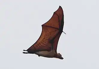 - ↑ a b Tsang, Susan M.; Wiantoro, Sigit; Veluz, Maria Josefa; Sugita, Norimasa; Nguyen, Y‐Lan; Simmons, Nancy B.; Lohman, David J. (2019). «Dispersal out of Wallacea spurs diversification of Pteropus flying foxes, the world's largest bats (Mammalia: Chiroptera)». Journal of Biogeography. 47 (2): 527–537. PMC 7546435