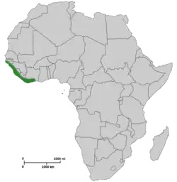 Pode ser encontrada nos seguintes países: Costa do Marfim, Guiné, Senegal, Serra Leoa, e possivelmente Guiné-Bissau e Libéria.