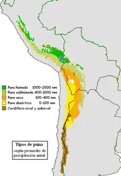- 'Puna sub-úmida:' Ou puna semi-úmida, intermediária entre a puna úmida propriamente dita e a puna seca.