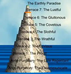 No início da subida da montanha estão esperando arrependidos tardios, que têm de aguardar a permissão para passarem pela Porta de São Pedro antes de iniciarem sua ansiada subida. Cada um dos sete círculos correspondem a um dos Sete pecados capitais, na seguinte ordem: Orgulho, Inveja, Ira, Preguiça, Avareza junto ao Pródigo, Gula e Luxúria. Os Avarentos e Pródigos estão juntos no mesmo círculo, pois são os dois extremos, onde o avarento super valoriza o dinheiro e o Pródigo o desperdiça.