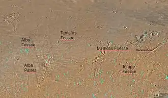 Graben próximo a Alba Patera, visto pela THEMIS. Grabens e catenae são formações de colapso, ambos causados por falhas. Quando a crosta é esticada, falhas se formam e materiais caem no vazio causado pelo estiramento. Os vulcões Uranius Tholus (acima) e Ceraunius Tholus (o maior) são visíveis em um contexto amplo, abaixo e à direita de Alba Patera.