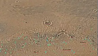 - ↑ M. C. Malin and K. S. Edgett. «OBSERVATIONS OF APRONS IN MARTIAN FRETTED TERRAIN.» (PDF) (em inglês). Consultado em 22 de novembro de 2014