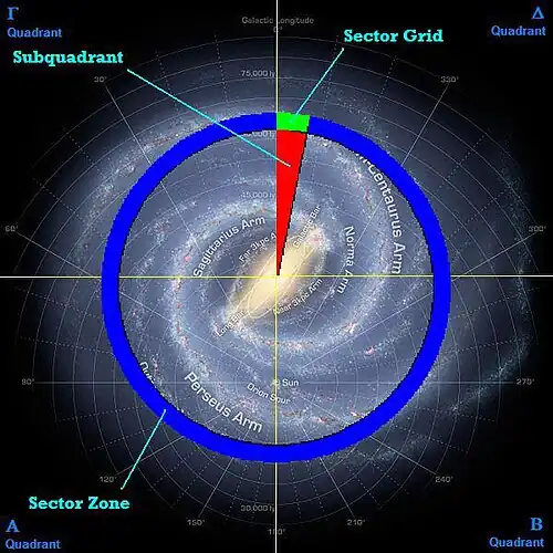 Os quadrantes são subdivididos em subquadrantes (36 subquadrantes, nominados 0, 1, 2, 3, 4, 5, 6, 7, 8, 9, A, B, …, Z ). Cada subquadrante é dividido em 10 grades de setor (Sector Grids), numerados de 0 a 9, que são a intersecção entre uma zona de setores e um subquadrante. Uma zona de setor é um círculo concêntrico de largura de 5.000 anos luz centrado no núcleo da galáxia.[1][2]