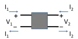 Um quadripolo, rede de duas portas ou dispositivo de duas portas é um circuito elétrico ou dispositivo com dois pares de terminais. Dois terminais constituem uma porta se eles satisfazem a exigência essencial conhecida como condição de porta: a corrente que entra em uma porta deve ser a mesma que saia dela.[1][2] Exemplos incluem modelos para transistores de sinais (tais como modelo híbrido-pi), filtros e casamento de impedâncias, também denominado por muitos autores como adaptação de impedâncias, dado que são utilizados para adaptar um circuito de baixa-impedância a um de alta-impedância e vice-versa.