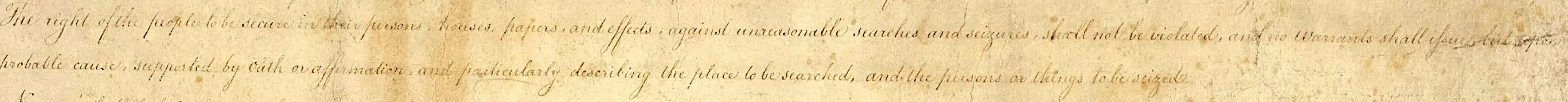 | “ | O direito das pessoas de estarem seguras em suas pessoas, casas, papéis e pertences, contra buscas e apreensões não razoáveis, não deve ser violado e nenhum mandado deve ser emitido, mas por causa provável, apoiado por juramento ou afirmação, e particularmente descrevendo o local a ser revistado e as pessoas ou coisas a serem apreendidas.[4] | ” |