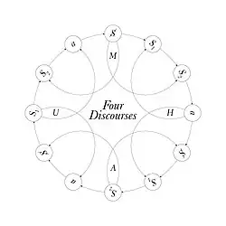 O discurso, em primeiro lugar, refere-se a um ponto em que fala e linguagem se intersectam. Os quatro discursos representam as quatro formulações possíveis da rede simbólica que os laços sociais podem assumir e podem ser expressos como as permutações de uma configuração de quatro termos mostrando as posições relativas – o agente, o outro, o produto e a verdade – de quatro termos., o sujeito, o significante mestre, conhecimento e objet petit a.