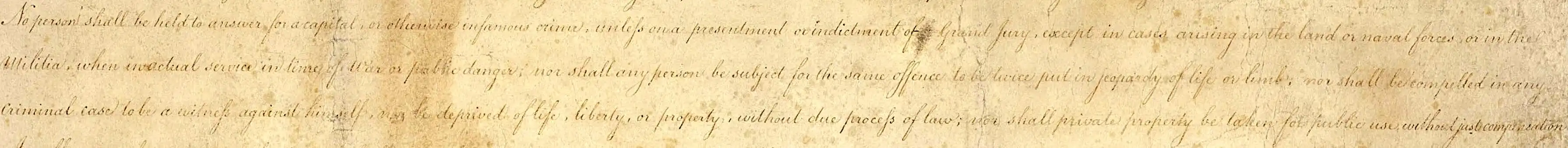 | “ | Nenhuma pessoa poderá responder por um crime capital, ou outro crime infame, a menos que em uma apresentação ou acusação de um Grande Júri, exceto em casos surgidos nas forças terrestres ou navais, ou na milícia, quando em serviço real a tempo de Guerra ou perigo público; nem qualquer pessoa estará sujeita à mesma ofensa e por duas vezes com risco de vida ou integridade física; nem será obrigado em qualquer processo criminal a ser testemunha contra si mesmo, nem ser privado da vida, da liberdade ou dos bens, sem o devido processo legal; nem a propriedade privada será levada ao uso público, sem justa compensação.[4] | ” |