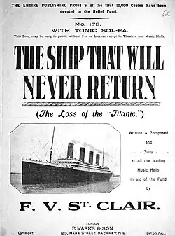 Os compositores britânicos comemoraram o desastre com apelos aos sentimentos religiosos, chauvinistas e heróicos. Músicas foram lançadas com títulos como Stand to Your Post (Women and Children First!) e Be British (Dedicated to the Gallant Crew of the Titanic), o último referindo-se às últimas palavras míticas do capitão Smith.[28] The Ship That Will Never Return de F. V. St Clair proclamava: "As mulheres e crianças primeiro para os barcos -! E os marinheiros sabiam obedecer,"[29] enquanto "Be British" instava os ouvintes a lembrar a situação dos sobreviventes e doar para os fundos de caridade criados para ajudá-los: "Mostre que você está disposto! com um centavo ou um xelim! para aqueles que eles deixaram para trás."[30]
