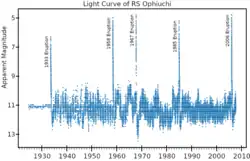 - ↑ «[vsnet-alert 26131] Outburst of RS Ophiuchi». ooruri.kusastro.kyoto-u.ac.jp. Consultado em 9 de agosto de 2021