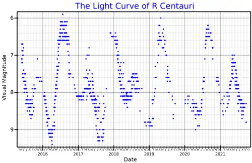- ↑ a b c d Hawkins, G.; Mattei, J. A.; Foster, G. (abril de 2001). «R Centauri: An Unusual Mira Variable in a He-Shell Flash». The Publications of the Astronomical Society of the Pacific. 113 (782): 501-506. Bibcode:2001PASP..113..501H. doi:10.1086/319542