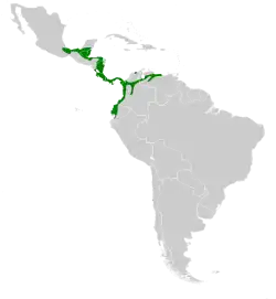 Esta beija-flor ocorre nas partes mais ao sul do México (incluindo o nordeste de Oaxaca e sul de Veracruz ao leste e sul de Quintana Roo), Belize, nordeste de Guatemala, Honduras setentrional oriental, Nicarágua, Costa Rica, Panamá, Colômbia ocidental, central e oriental (majoritariamente nas planícies do Pacífico e na região do vale Magdalena), no oeste equatoriano (ao sul de El Oro), e nordeste de Venezuela (em ambas as encostas dos Andes e das montanhas setentrionais). Esta espécie de eremita se encontra distribuído em uma variedade de habitats arborizados, como em florestas, bosques, clareiras, bosques cerrados e jardins; tipicamente em regiões úmidas, mas, territorialmente, em habitats mais áridos e decíduos (especificamente, no Equador). Pode ser majoritariamente encontrada em planícies e contrafortes, e foi excepcionalmente registrada à uma altitude de 1,800 metros acima do nível do mar. Entre suas altitudes mais comuns estão entre 500 a 550 metros acima do nível do mar no Equador.[18]