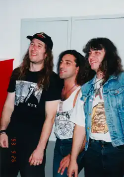 ![]() Da direita para a esquerda: Victor Smolski, Peavy Wagner, e André Hilgers, depois de uma apresentação no ano de 2008 em Milão, Itália. | |