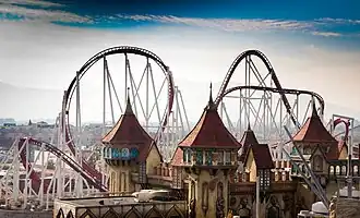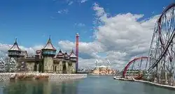 ![]() Vista do castelo e da montanha-russa em volta do parque. | |