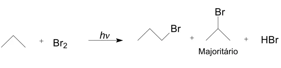 Na reação do propano, o 2-bromopropano é o produto majoritário da reação, pois a velocidade de abstração do hidrogênio secundário é maior que o primário, devido a menor barreira energética existente na remoção do hidrogênio secundário. A 150 °C o rendimento relativo ao 1-bromo-propano é de 8% dos produtos monobromados, enquanto que 2-bromopropano tem um rendimento relativo de 92%. Na reação de bromo radicalar em cadeia, o propano pode sofre mais de uma halogenação. Isso porque nos produtos formados 1-bromopropano e o 2-bromopropano, os 5 hidrogênios remanescentes são tão reativos quanto aqueles do propano. A consequência disso é que a bromação de bromopropano também pode ocorrer gerando dibromopropanos, que por sua vez, também podem gerar tribromopropanos ou até mesmo a substituição de todos os hidrogênios por bromo.[2]