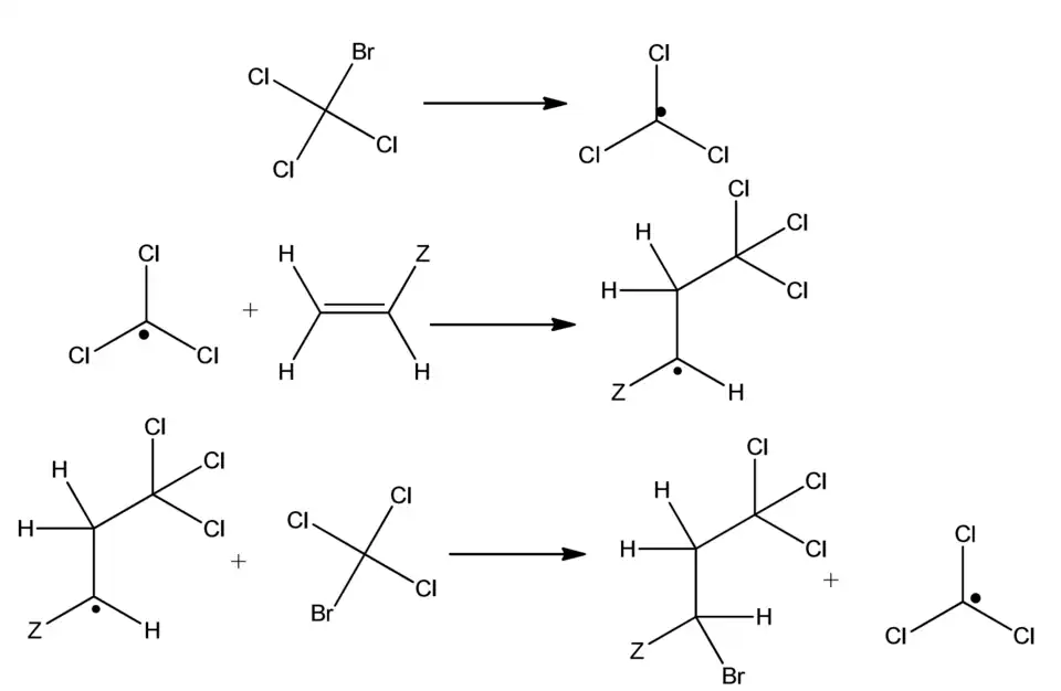 A adição de radicais livres de halometanos a alcenos é um processo em cadeia que depende de fácil abstração de halogênio ou de hidrogênio do halometano. Segue o exemplo de adição do tetrabromometano.[5]