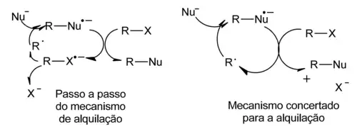 O ponto principal para a eficiência de uma reação SRN1 é a transferência de elétrons para o reagente alquilante. Este processo pode ocorrer passo a passo, se o ânion radical formado é suficientemente estável, mas também, pode ocorrer de forma concertada. O caminho concertado é o mais provável para haletos de alquila. A reação combinada de radical e nucleófilo é bastante rápida.
