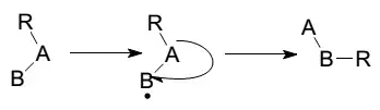 O novo radical livre formado deve se estabilizar por uma nova reação. A ordem da estabilidade de radicais nos leva a prever que, assim como com rearranjos de carbocátion, as migrações devem ocorrer, na ordem de prioridade, no carbono primário<secundário<terciário.[2]