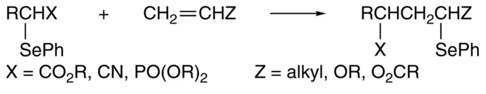 Adições de selenetos pode ser realizadas via radicais livres na presença de tri-n-butilestanano, o radical gerado pela adição é reduzida pela abstração de hidrogênio. A reação em cadeia é então continuada pela abstração do seleneto pelo radical estanilo, o que leva à ciclização dos produtos.