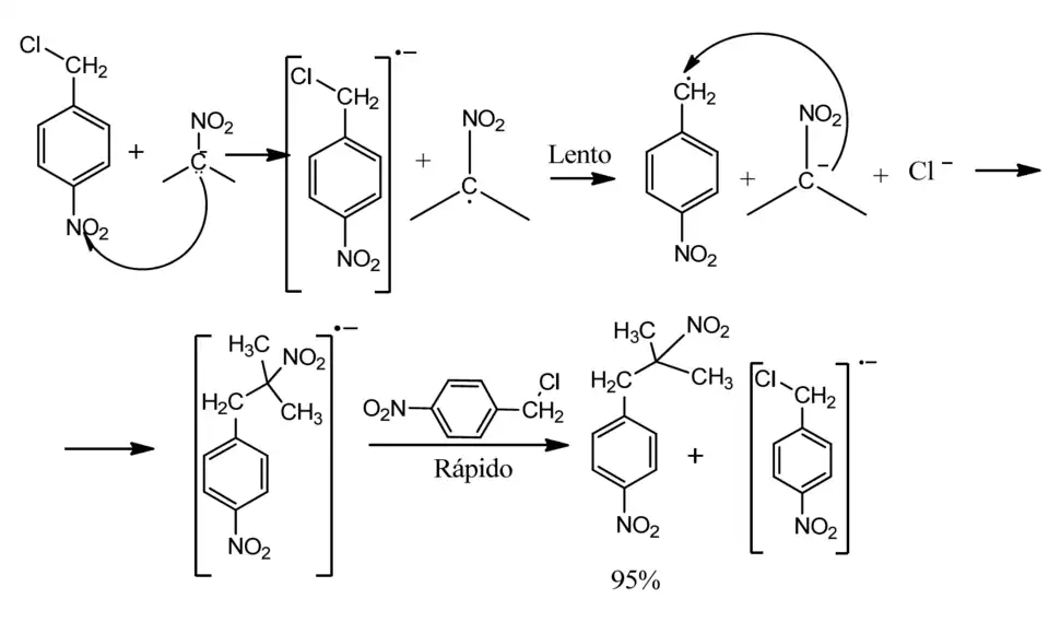 A forma de ressonância em que a carga negativa está sobre o carbono secundário, também pode ocorrer via o mecanismo SN2. Neste caso, o carbono nucleofílico irá deslocar o halogêneo do grupo benzílico para se obter o composto C-alquilado. Em uma alquilação SN2 a proporção dos produtos C-alquilado para O- alquilados é favorável aos compostos O-alquilados. A razão para isso é o baixo impedimento estérico presente em torno do ânion de oxigênio em comparação com o ânion do carbono secundário. Tal como referido acima, entretanto, no caso da reação entre cloreto de 4-nitrobenzilo e 2-nitropropano, a relação encontrada foi a favor do composto C-alquilado, e a cinética foi considerada de primeira ordem. Esta aparente contradição entre a expectativa para uma rota de SN2 e os resultados observados levou Kerber et al. a propor um mecanismo radicalar de primeira ordem. Eles sugeriram que a simples transferência de elétron (SET) para o cloreto de 4-nitrobenzilo, conduz à formação de um ânion radical. Esta espécie de radicais, em seguida, passa por decomposição, para se obter um radical 4-nitrobenzilo e um ânion cloro, o que se acredita ser o passo determinante da velocidade da reação.[1]