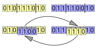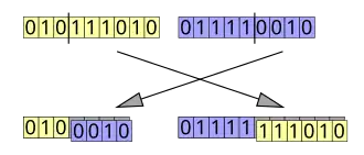 Um único ponto para recombinação é selecionado em ambos os organismos progenitores. Todos os dados além do ponto selecionados são trocados entre os progenitores. Os organismos resultantes são os filhos: