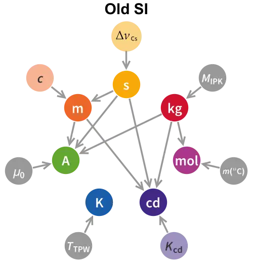 O sistema SI antes da redefinição: dependência das definições da unidade básicas em outras unidades básicas (por exemplo, o metro é definido pela distância percorrida pela luz em uma fração específica de um segundo), com as constantes da natureza e artefatos usados para defini-los (como a massa do IPK para o quilograma).