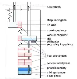 Na câmara de mistura, duas fases da mistura 3He–4He, a fase concentrada (praticamente 100% 3He) e a fase diluída (cerca de 6,6% de 3He e 93,4% de 4He), estão em equilíbrio e separadas por uma fronteira de fase. Dentro da câmara, o 3He é diluído à medida que flui da fase concentrada através da fronteira de fase para a fase diluída. O calor necessário para a diluição é a potência de resfriamento útil do refrigerador, pois o processo de mover o 3He através da fronteira de fase é endotérmico e remove calor do ambiente da câmara de mistura. O 3He então deixa a câmara de mistura na fase diluída. No lado diluído e no still, o 3He flui através do superfluido 4He, que está em repouso. O 3He é impulsionado através do canal diluído por um gradiente de pressão, assim como qualquer outro fluido viscoso.[5] No seu caminho para cima, o 3He frio e diluído resfria o 3He concentrado que desce através dos trocadores de calor e entra no still. A pressão no still é mantida baixa (cerca de 10 Pa) pelas bombas à temperatura ambiente. O vapor no still é praticamente 3He puro, que tem uma pressão parcial muito maior do que o 4He a 500–700 mK. O calor é fornecido ao still para manter um fluxo constante de 3He. As bombas comprimem o 3He a uma pressão de algumas centenas de milibar e o devolvem ao criostato, completando o ciclo.